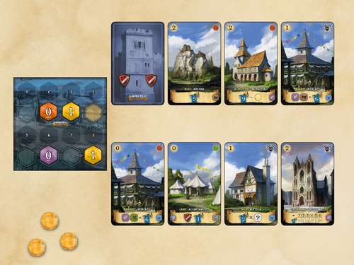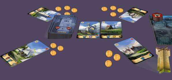 人数に応じて建物カードを準備し、それら建物カードをシャッフルして、テーブルに山札として配置します。スタートプレイヤーを決め、各プレイヤーは開始時のコインをプレイ順番に対応して受け取ります。残りのコインはストックとします。