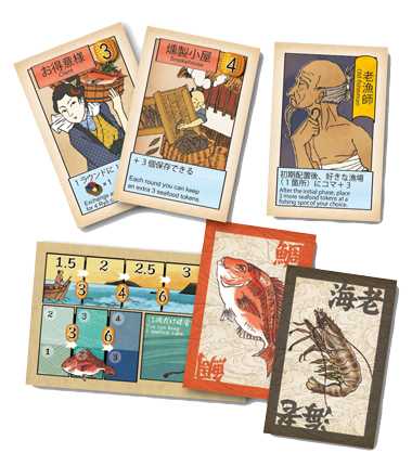 タイ、アジ、エビ、ハマグリなどの漁を生業とした漁師たちが、江戸湾に船を出し、漁を行い、水揚げをすることで市場は活気に満ちあふれていました。江戸の民の食を満足させ、一番の富を得るのはどのプレイヤーでしょうか?