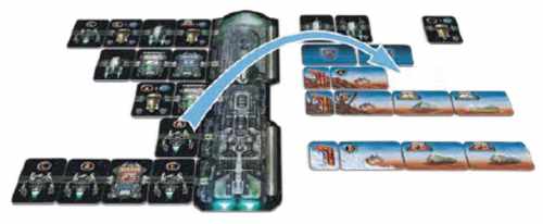 スロットの一番上に置いた士官カードは、5箇所あるあなたのドッキングベースのどこに配置すべきかを示し、モジュールをとったら該当するドッキングベースに配置します。すでに1つ以上のモジュールが置かれないならばその左隣に置きます。