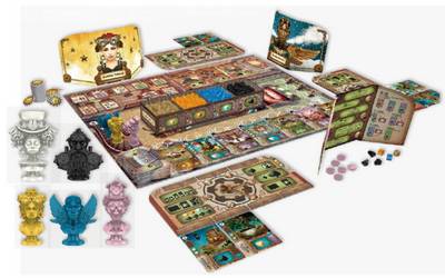 美しく幻想的でシュールなアートワークの登場人物と機械たちと豪華なコンポーネントもさることながら、カードをピックする順番のジレンマ、アクションの選択は毎回違った位置に2つ連動した針を動かして選ばなくてはならないままならなさ、合成機械のリソース生産・変換の楽しさ、そして隠されたリソースと勝利点による緊迫した展開が楽しめる注目の作品です!