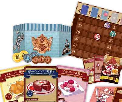 プレイヤーは2枚ある場札からカードを1枚選択し自分のデックに加えつつ、手札からカードを選び効果を発揮します。お菓子のカードが出されたなら競り開始の合図、勝者がお菓子を手に入れることができます。