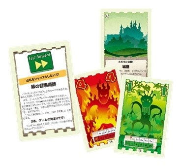 この「Fast Forward」シリーズは、「フルーツジュース」で新たに使われたFable Gameシステムを採用しています。番号順に重ねられた山札を使ってプレイしていくとカードやルールの「発見」が行われていきます。