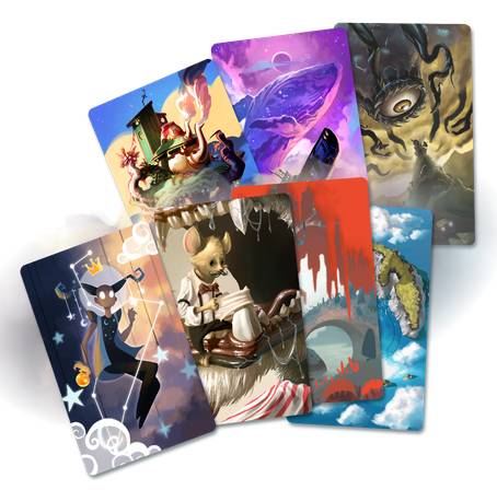 グループをチームに分け、マスターピースカードとインスピレーションカードをそれぞれよく切り山札にします。