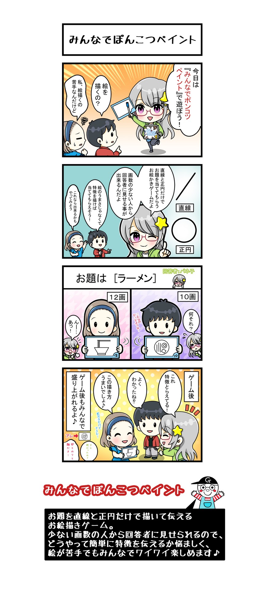 「みんなでぽんこつペイント」は、サイコロの目で決められたお題を「直線」と「正円」だけで表現するお絵かきゲームです。回答者にお題を当ててもらえるように、工夫をこらして絵を描きましょう。