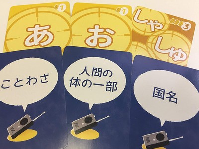 その山札をめくると「お題」と「文字」の組み合わせが出来ます。 例えば「冷たいもの」と「こ」の組み合わせです。
