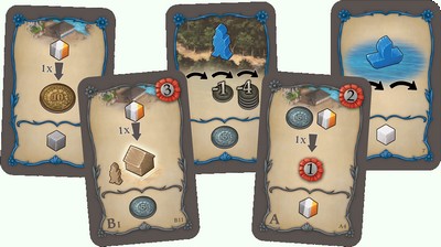 8、海外交易:自分の船が外側の海マスにあれば、指示された商品3個を自分の船室から支払い、そこの成果カード1枚を取得できます。レベルAの成果カードを取る場合、その海マスにあるお金もすべて取ることができます。