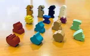 「エレメンタルトランクマン」は、実際に精霊のコマをダイスのように振って、その結果から精霊を召喚したり、精霊の力を用いて多くの宝箱を開けて得点を得るゲームです。