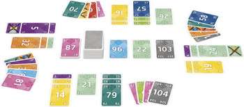 0から109の数字カードと10枚のブロックカードをよく混ぜて、各プレイヤーに4枚ずつ配ります。