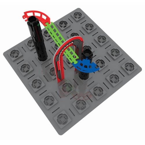 問題カードに書かれている通りに柱を配置し、空いたスペースにレールや柱などのパーツをどう置けばいいか考えていき、レールを設置します。