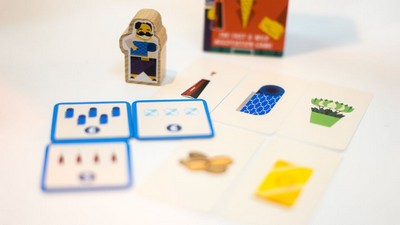 ルールカード3枚をテーブルに並べ、ディールメーカーの木製フィギュアを準備します。