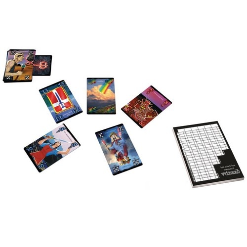 ラウンド枚数の手札でトリックテイキングゲームを行います。最初に切り札が決定し、順番になんとリック取れるか予想していきますが、トランプにはない4枚の勝てるジョーカー「ウィザード」、4枚の負けるジョーカー「ジェスター」が、ゲームをより一層混沌とさせますので、予想もままなりません。