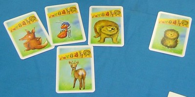 各プレイヤーは12枚の裏向きのカードのデッキから始め、各カードはその上に7匹の動物のうちの1匹を示しますが、カードは裏向き置かれます。