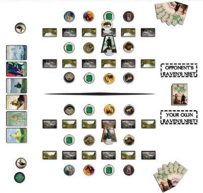 対戦相手は向かい合わせにし、対戦相手は山カードいずれか1枚の上にカラスのコマを置きます。