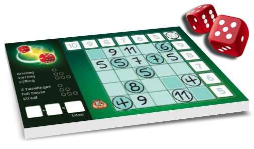 もし縦、横、対角線の一列にある5つの数字で、ポーカーダイスの役であるスリーカード、フルハウス、ストレートなどの組み合わせができたら、その列にある数字のいくつかにマルをつけます。