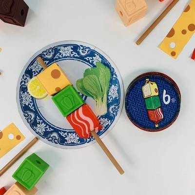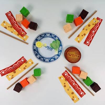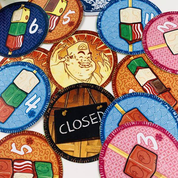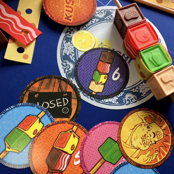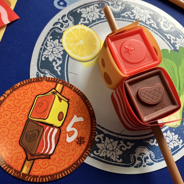 各プレイヤーは、4種類の材料キューブと2種類のトッピングシート、1本の串を受け取ります。