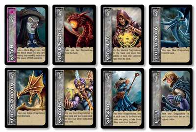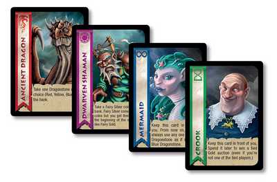 各色のドラゴンストーンを得たり、ドラゴンストーンを消費することで得点を得たり、妖精金貨や普通金貨や銀貨を得たり、他のプレイヤーのドラゴンストーンを得たり、その他特殊な効果をカードから得ることが出来ます。