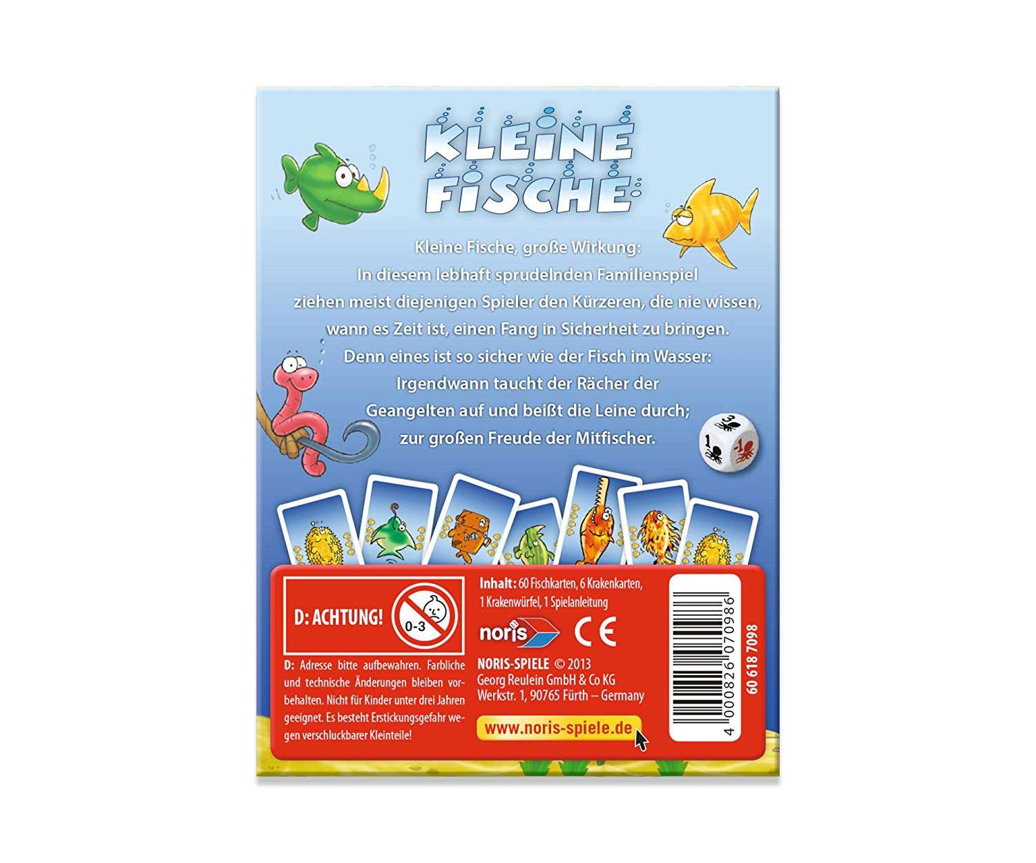 カードをめくって書かれた魚の得点を効率よく集めていくゲームで、結果的に魚カードは各種1枚しか得点なりません。何枚かめくっていきこの手番に既に出た同じ種類の魚が出たときか、タコカードをめくった時点で強制終了、同じ種類の魚カードの間にめくったカードが場に流れます。