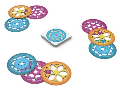 このゲームでは、プレイヤーは両面印刷のカラフルなディスクを3枚ずつ受け取り、そのディスクを使ってテーブル中央のお題カードの図形を全員一斉に作ります。