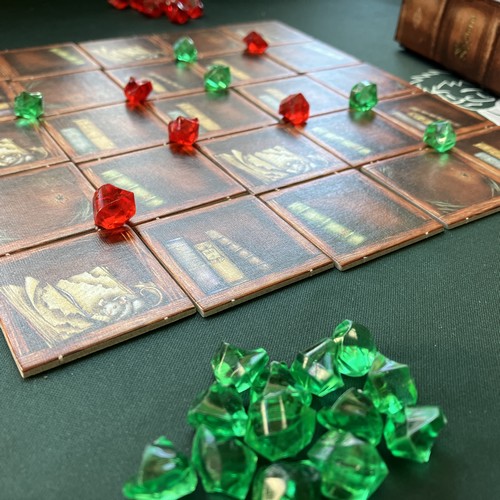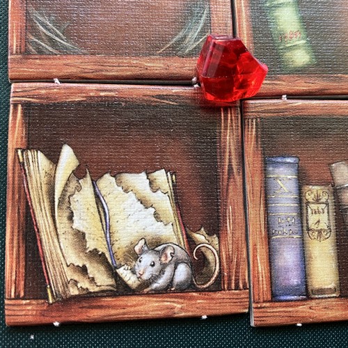 ポイント:交点に自分のコマを置き、1枚のタイルに優勢であれば、その本を獲得できる囲碁のテイストを持ったゲームですが、マウスは-1点になります。思考ゲームです。箱は本のディテールになります。