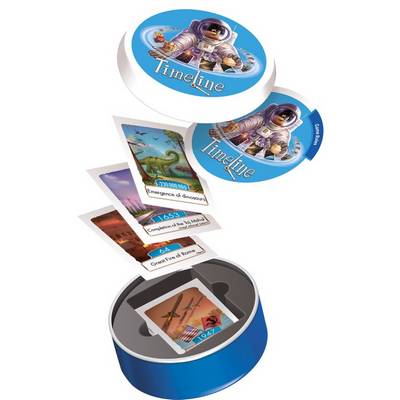 水色の缶に入った『タイムライン:出来事編』は、世界史上の事件やイベントをフィーチャーした55枚のセットです。