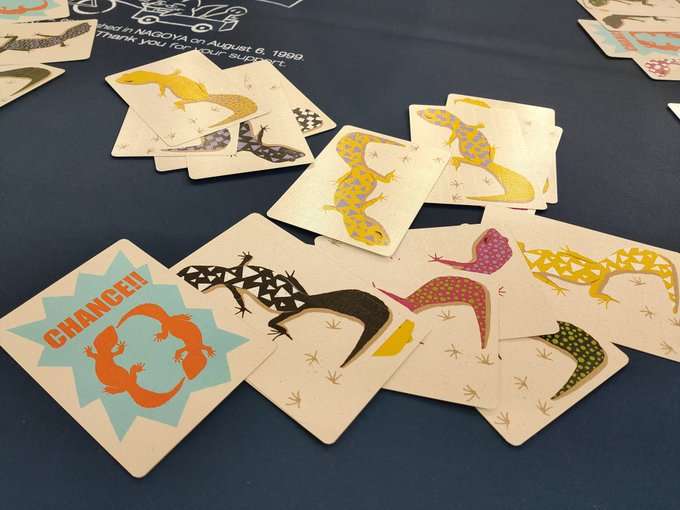 スタートプレイヤーから順に裏向きのカードを1枚ずつめくっていき、場にはレオパが1匹、また1匹と増えていきます。