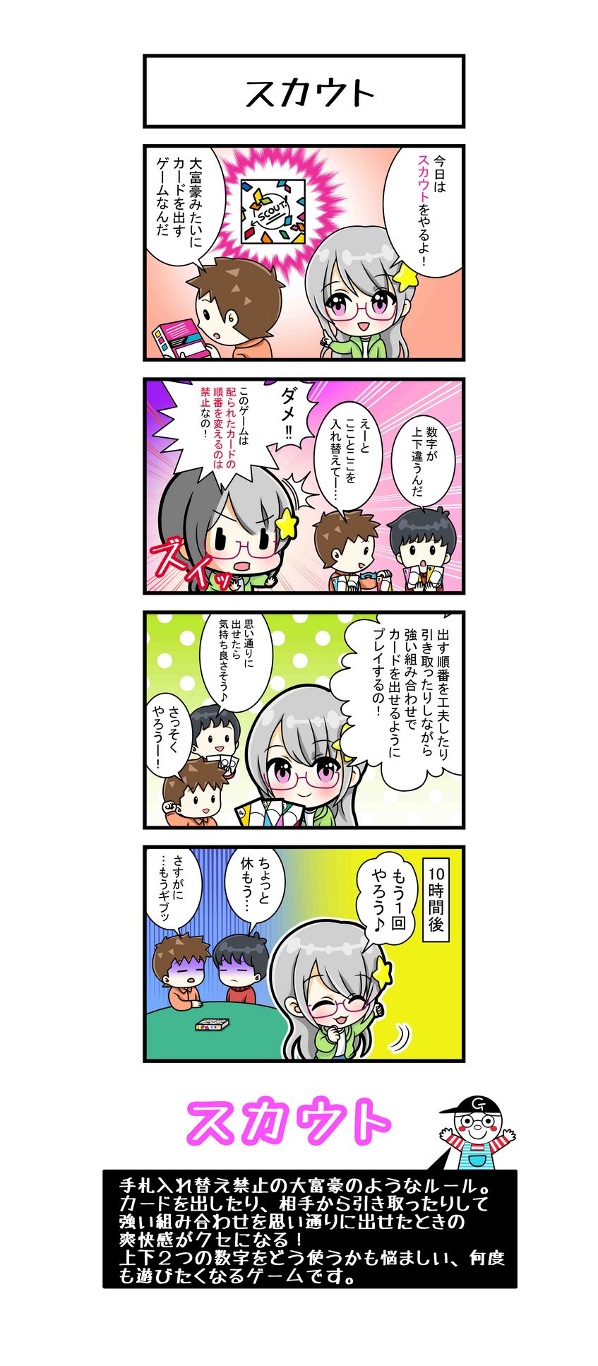 「スカウト!」は、カードを出すか引き抜くかを検討していき、手札の数字を連鎖させることで手札をなくすゲームです。