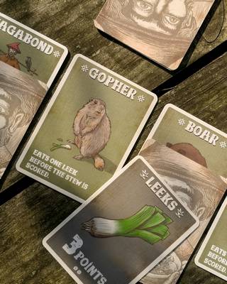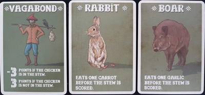 2、空腹の厄介者に食べ物を与える:材料カードを裏向きにして、まだ材料カードの載っていない厄介者カードの上に置き、材料カードが上に置かれた厄介者は食べ物を与えられ満足します。反対に食べ物を与えられていない厄介者はまだ空腹なため、『シチュー!』と宣言されたら鍋から好物を1枚与えなければいけません。