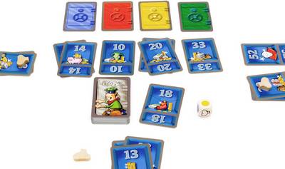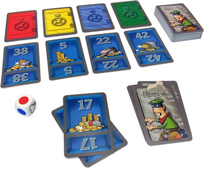 自分の番でサイコロを振り、示された色の金庫の数値を見て、山札からめくるカードの数値がそれよりも高いか低いかを予想します。