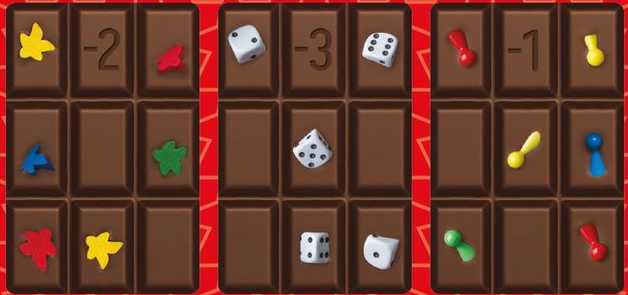 ただし、職場でボードゲームを遊んだばかりに、ゲームに使うコマがチョコレートに混ざり、これらのチョコレートにはマイナスポイントになります。