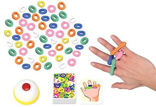 「ハリガリ・リング」は、カードに描かれた色や指の組合せを見本として、自分の指にゴムをかけます。