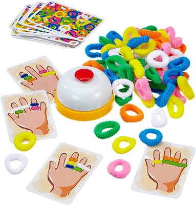 ルールはとっても簡単。カードを1枚めくったら、全員で一斉に、カードと同じようにカラフルなゴムバンドを自分の指にはめます。