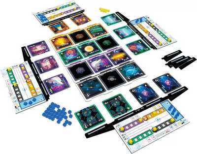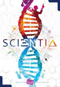 「「サイエンティア」は、物理学/化学/生物学/天文学の4つの科学分野の発展を競う戦術的な、エンジンビルディング系のゲームです。