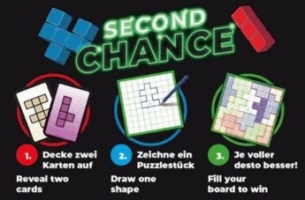 もしめくられたタイルのどちらも自分のグリッドに描けなかったら、あなた専用にパズルタイルをもう1枚めくり、”セカンドチャンス”が与えられます。もしセカンドチャンスがグリッドに描けた場合は、普通に次のラウンドへ通常通りプレイを続行します。