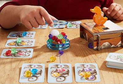 こぼれ落ちる宝石を、色を選んで1人1個ずつ回収し、手元のカードの「宝石スロット」に置いてその完成得点を競うゲームです。