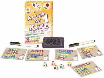 書いて消せるカードでロールアンドライト。お手軽でポップな紙ペンゲーム。こういうの大好物です。手元に2枚のカードがあり、カラーダイスを振って2回までキープしながら振り直して出目を決定させたらどちらか1枚に書けるだけ記入。三列完成で得点化。4枚得点化したらゲーム終了。