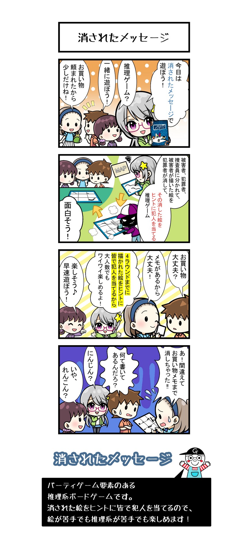 「消されたメッセージ」は、マップに描かれた多くの容疑者の中から、被害者が残した不完全なメッセージをヒントに犯人を探し当てる、コミュニケーション推理ゲームです。