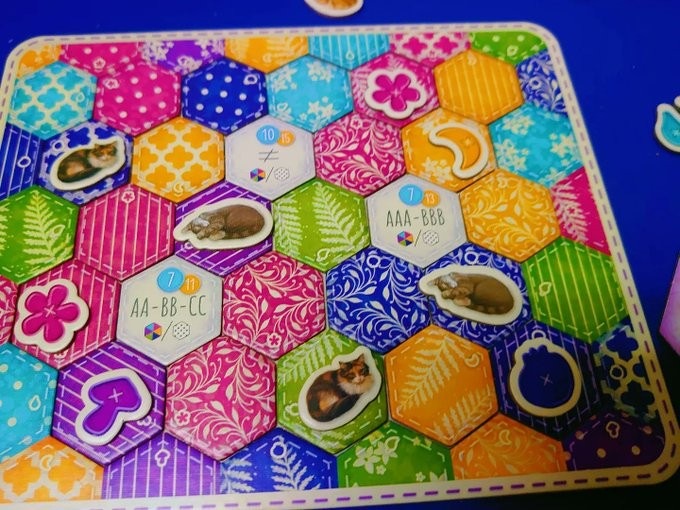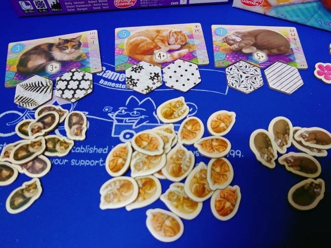ゲーム終了時には、ボタンの数、ネコの数、そして自分だけのキルトパターンを完成させることができたかどうかで得点を獲得します。