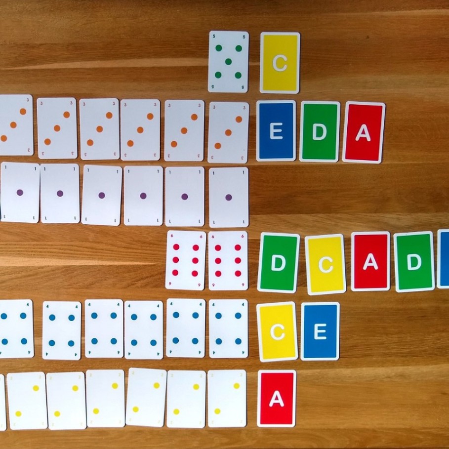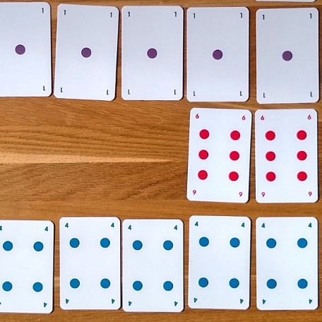 手番になったら手札からカードを出していき、同じ色のカードが一列に並べます。