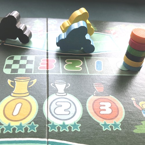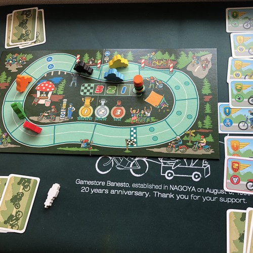 レースそのものは自動処理で進む。シンプルなサーキットでインコースを突っ切るだけだが、同じマスには止まれないことで波乱もあり。レース展開でドタバタ楽しめつつも、カードの取り合いによって先々のコントロールと心理戦がある不思議なミックス。