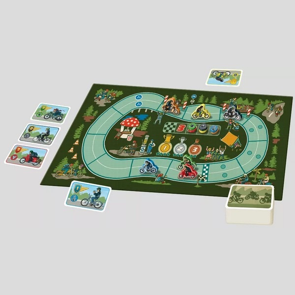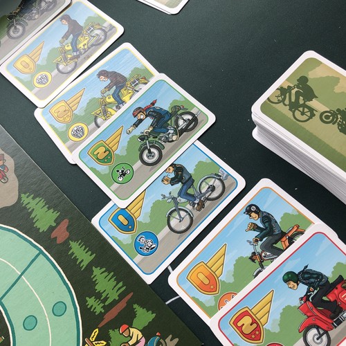 変則的なレースと競り。人数による規定枚数のカードが出てきてレースが展開。そのカードを使ってどれが1位になるか当てる。最終的に3位までが得点化できるルール。ここまで聞くとロイヤルターフやキャメルアップのような競馬的ギャンブルゲームのように思えるが、プレイヤーに選ばれなかったチケットは山札に戻ってレースが終わるまで再び循環する。多くのプレイヤーが序盤に賭ければ後半の失速は否めない。