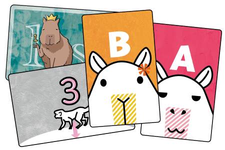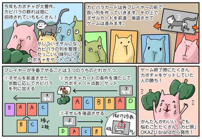 「カピ原」は、子ザルになって飛び回りカピバラの列を整理するカードゲームです。