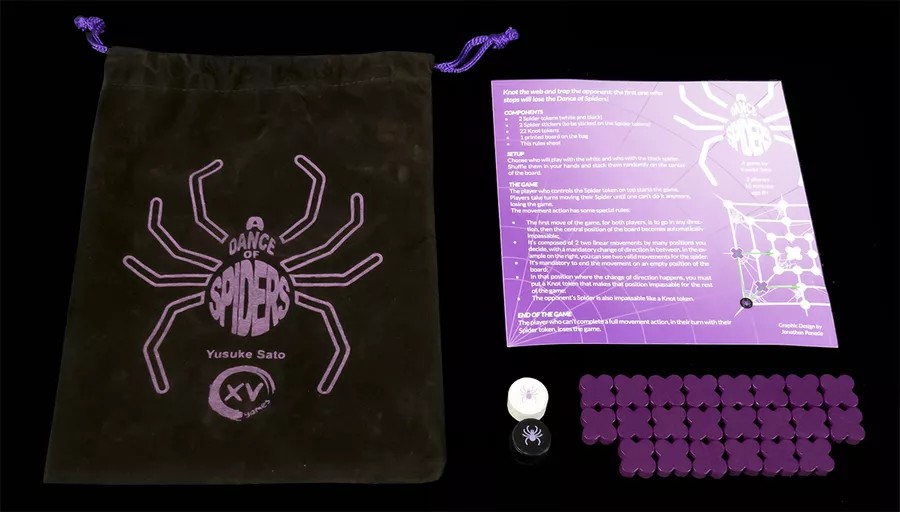 「蜘蛛のダンス」は、蜘蛛を動かし結び目マーカーを置くことで、相手の手詰まりを誘う、深い戦略性を持つ2人ゲームです。