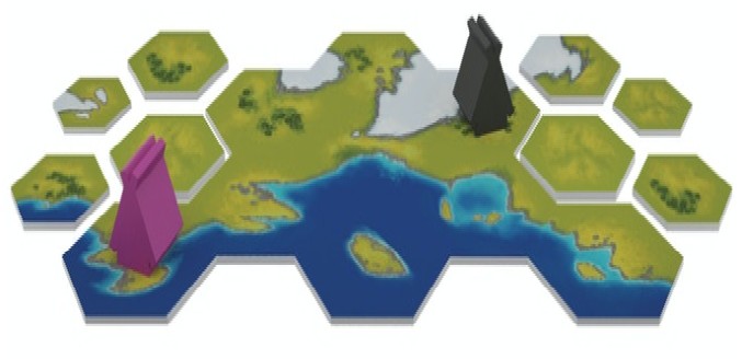 ・タイルの配置:タイルの山札から1枚をめくるか、公開タイル置き場から1枚とって、すでに場におかれた地形に接するようにします。