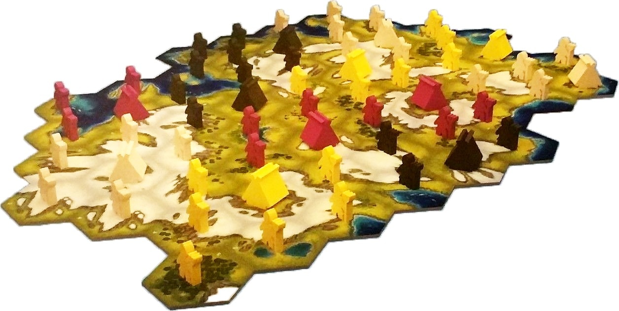プレイヤーは自分の色を選び、館4個と土地20個を受け取り、スタートタイルを並べます。