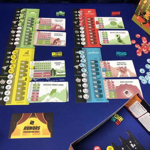 操作できるダイスと巧みな売買のプレイで、市場に影響を与え、うまくいけば株価を有利に曲げることができます。