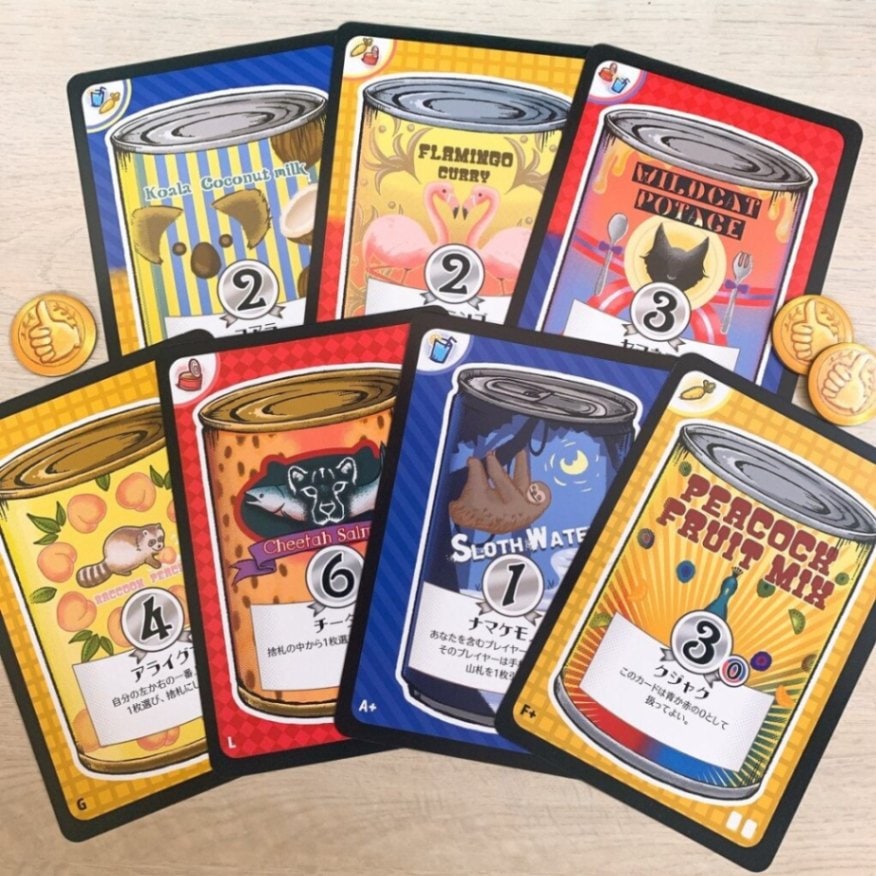 「カンカンカミング」は、プレイヤーの間に置かれた缶詰の効果を用いてセットあつめていくゲームです。