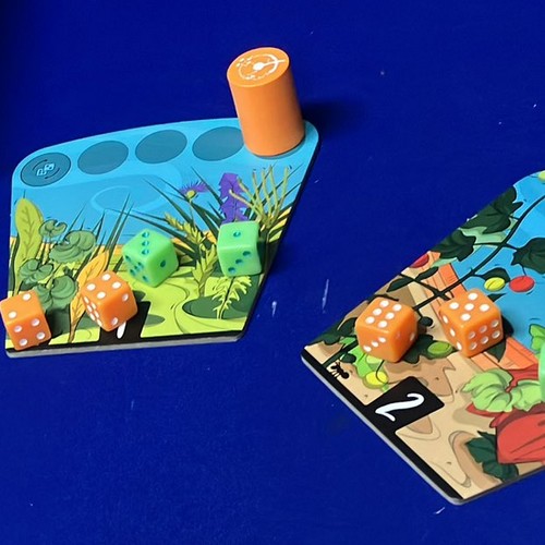 手番プレイヤーになったら、自分のダイスを1つ選んで、選んだダイスの目だけコマを進め、コマが止まったマスのエリアに、その目を維持した状態でダイスを置きます。