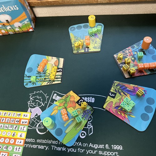 「ダンデライオンズ」は、タンポポを綿毛を飛ばす、ダイスをどう割り振っていくかのマジョリティ争いのゲームです。