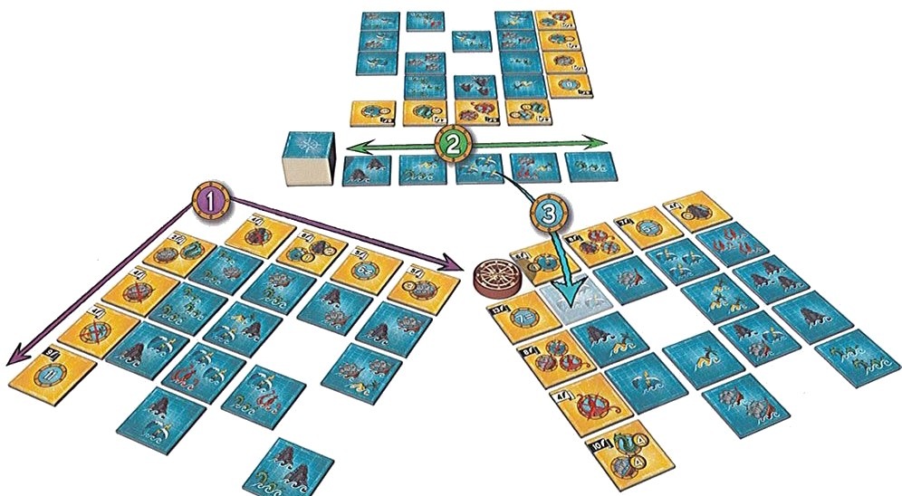 「ロスト・シーズ」は、海の探検家たちとなり、失われた海の探検を競い合い、地図を作成するタイル配置系のゲームです。