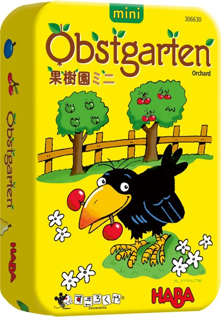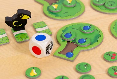 「果樹園ミニ」は、全員で協力して、カラスが果樹園に到達してしまう前に、サイコロの色に応じた果物を取り尽くせるかに挑戦する、3歳から遊べるゲームです。